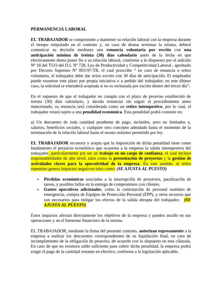 EL TRABAJADOR reconoce y acepta que la imposición de dicha penalidad tiene como