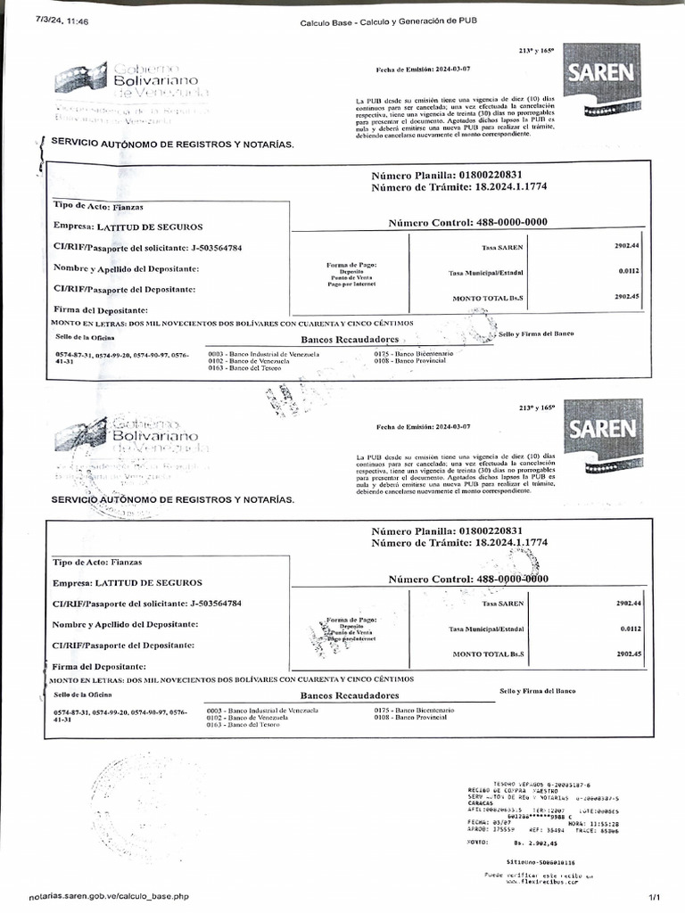 Servicio Autónomo de Registros y Notarias se canceló la cantidad de Bs. 2902.45, según Planilla Nº