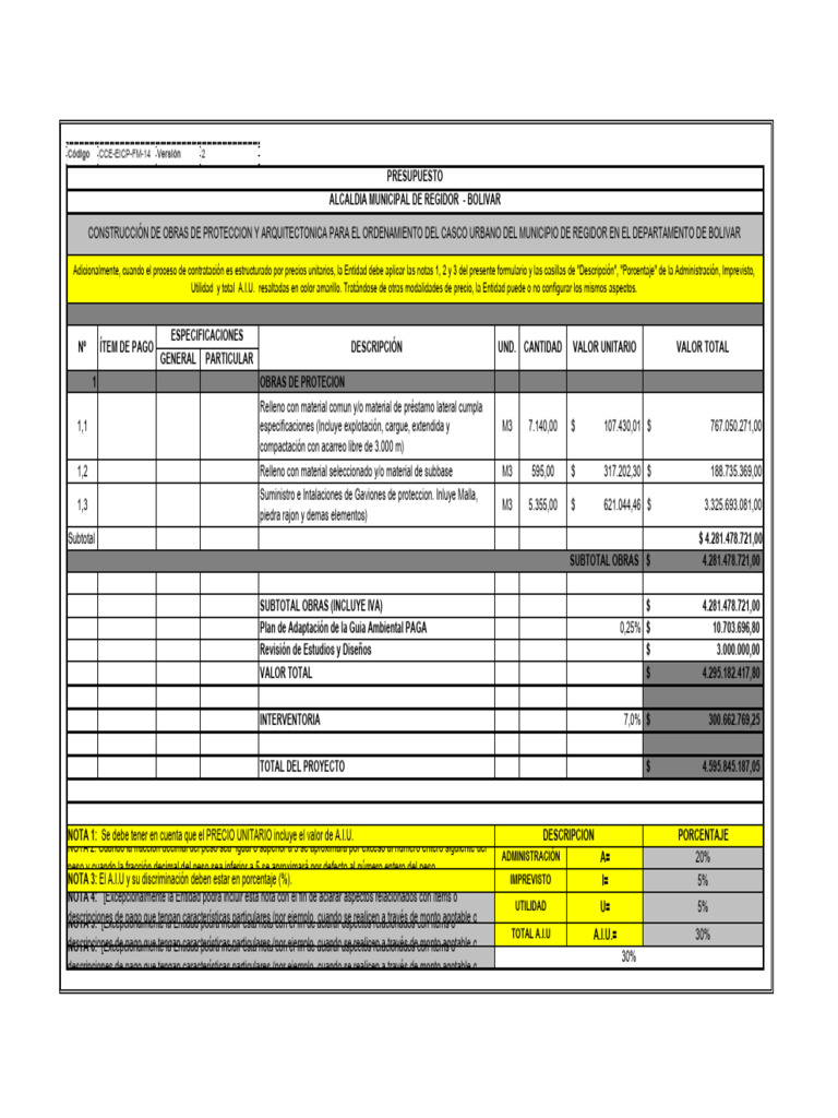 Adicionalmente, cuando el proceso de contratación es estructurado por precios unitarios, la Entidad debe aplicar las notas 1, 2 y 3 del presente formulario y las casillas de "Descripción", "Porcentaje" de la Administración, Imprevisto,