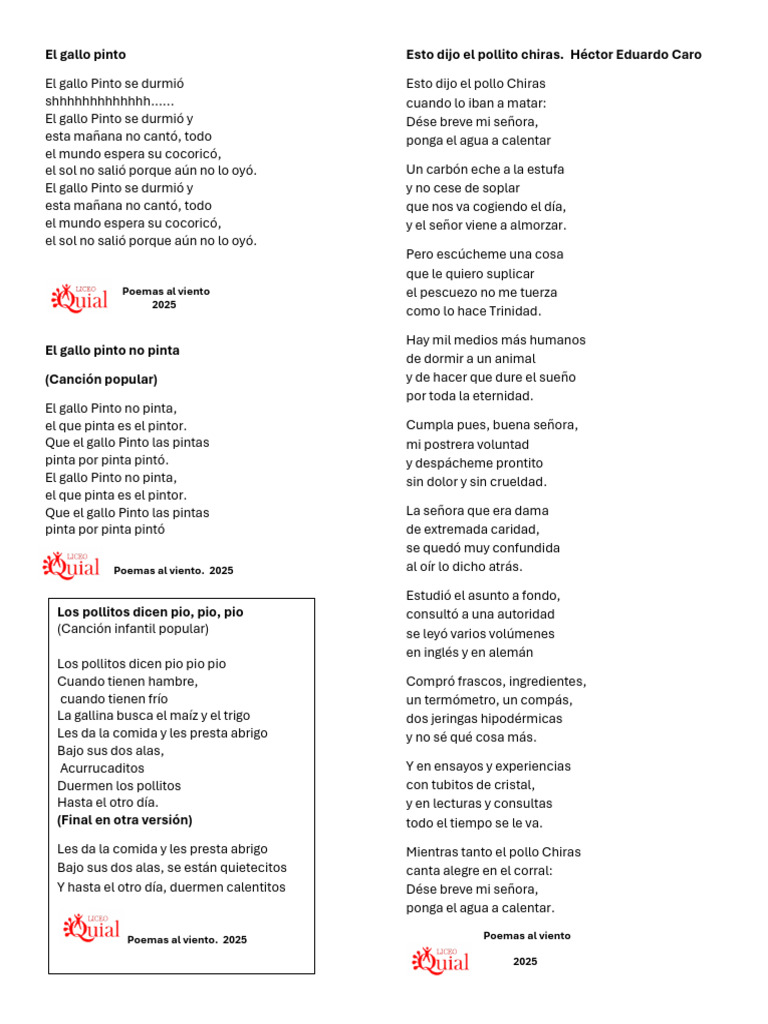 El gallo Pinto se durmió Esto dijo el pollo Chiras