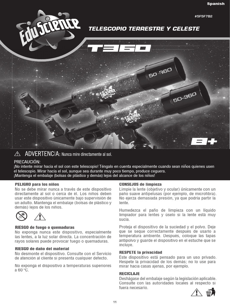 ¡No intente mirar hacia el sol con este telescopio! Téngalo en cuenta especialmente cuando sean niños quienes usen