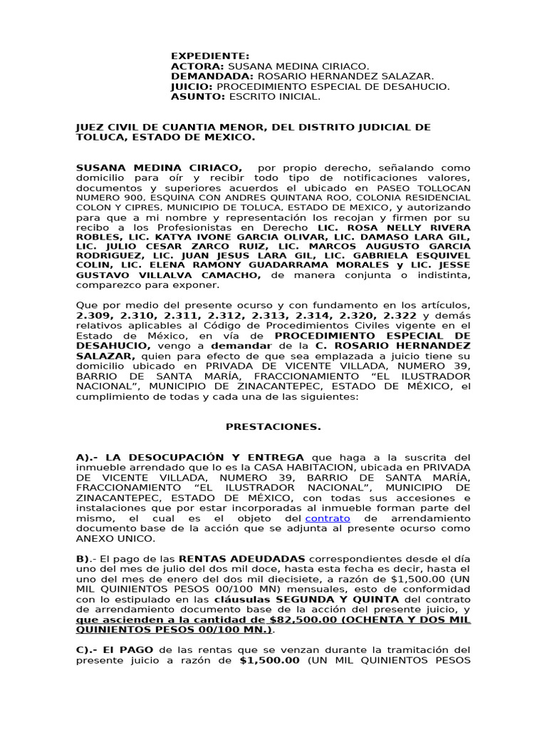 DESAHUCIO, vengo a demandar de la C. ROSARIO HERNANDEZ