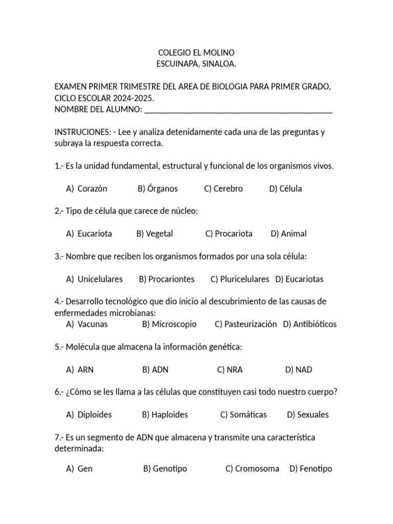 EXAMEN PRIMER TRIMESTRE DEL AREA DE BIOLOGIA PARA PRIMER GRADO,