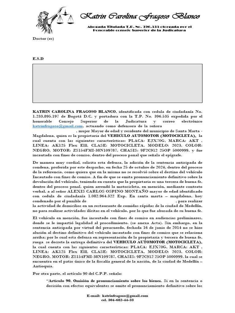 ruega se decrete la entrega definitiva del VEHICULO AUTOMOTOR (MOTOCICLETA),