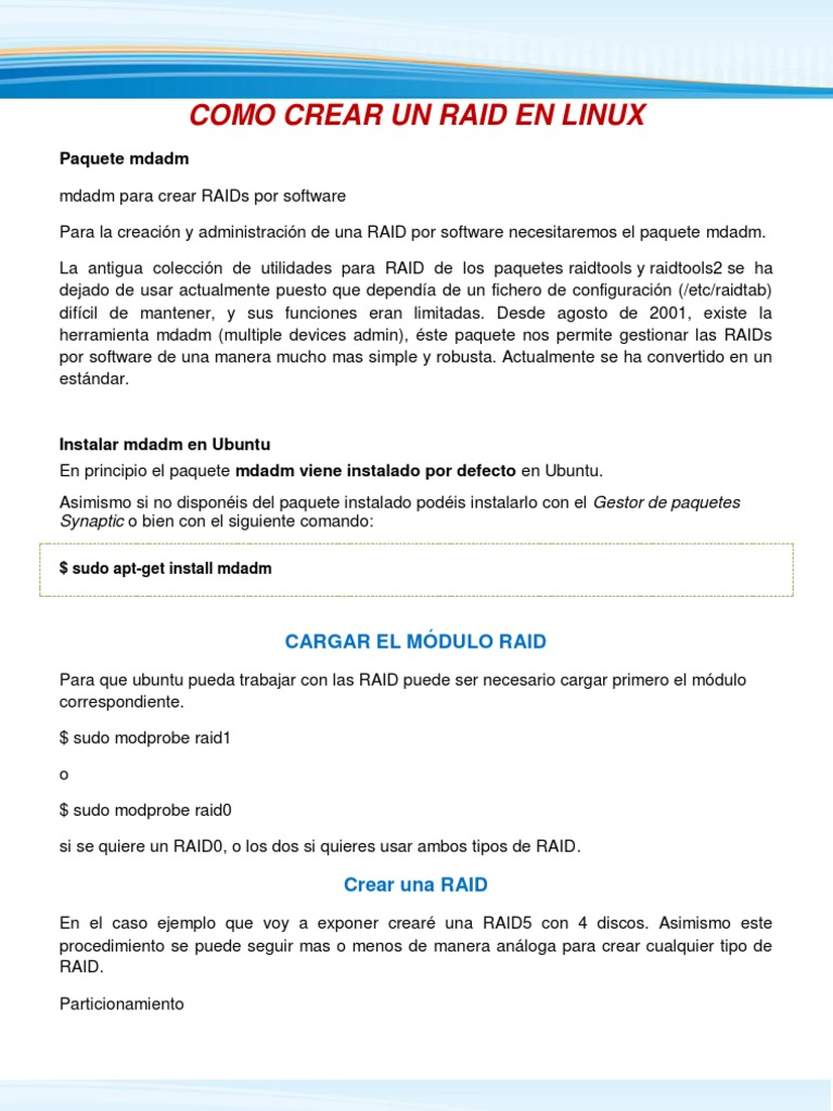 Primeramente antes de crear la RAID podemos ver en el fichero /proc/mdstat si al algn otro array: $ cat /proc/mdstat Personalities : Event: 0 unused devices: <none> Vemos que no aparece ningn array. Proseguimos a la creacin del md en el que crearemos la RAID. Para ello utilizaremos el comando mknod como se muestra en la siguiente orden: $ sudo mknod /dev/md0 b 9 0 Si ya tuviramos algn otro array llamado md0, podemos crear un md diferente: md1, md2, ... Procedemos ahora a crear finalmente la RAID: $ sudo mdadm --create /dev/md0 --level=raid5 --raid-devices=4 /dev/sdb1 /dev/sdc1 /dev/sdd1 /dev/sde1 Continue creating array? yes mdadm: array /dev/md0 started. La raid hecho esto empezar a crearse. Detalles del comando mdadm --create /dev/md0 --level=raid5 --raid-devices=4 /dev/sdb1 /dev/sdc1 /dev/sdd1 /dev/sde1 :