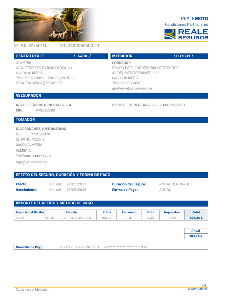 Efecto: 0 h. del 26/05/2025 Duración del Seguro: ANUAL RENOVABLE