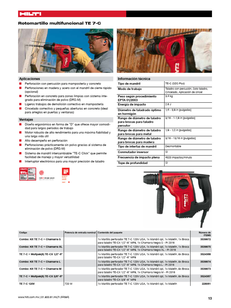 Combo: Kit TE 7-C + Chamarra S 1x Martillo perforador TE 7-C 120V USA, 1x Mandril cpl, 1x Maletín, 1x Broca 3539972