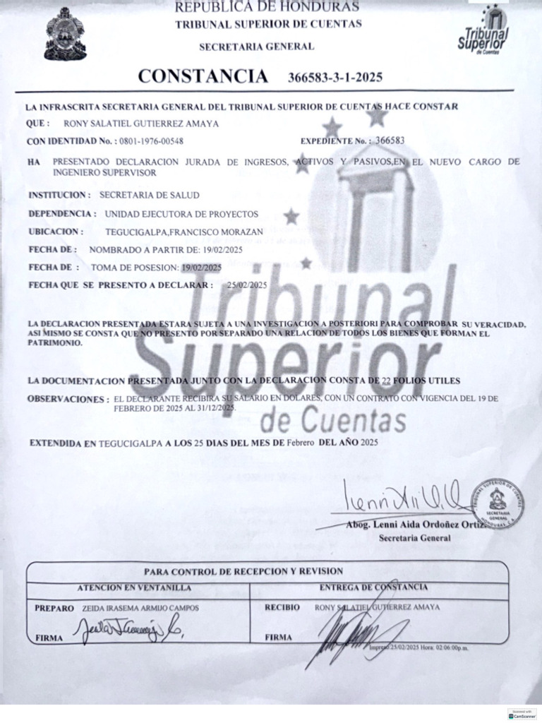 Rony Salatiel Gutiérrez Amaya ha presentado su declaración jurada de ingresos y pasivos como nuevo Ingeniero Supervisor en la Secretaría de Salud, con efecto a partir del 19 de febrero de 2025. La consultoría tiene una duración hasta el 31 de diciembre de 2025, con un costo total de USD 36,166.70, financiada por el Banco Interamericano de Desarrollo. Los pagos mensuales se establecen en USD 3,500.00, comenzando con un pago inicial proporcional en febrero.
