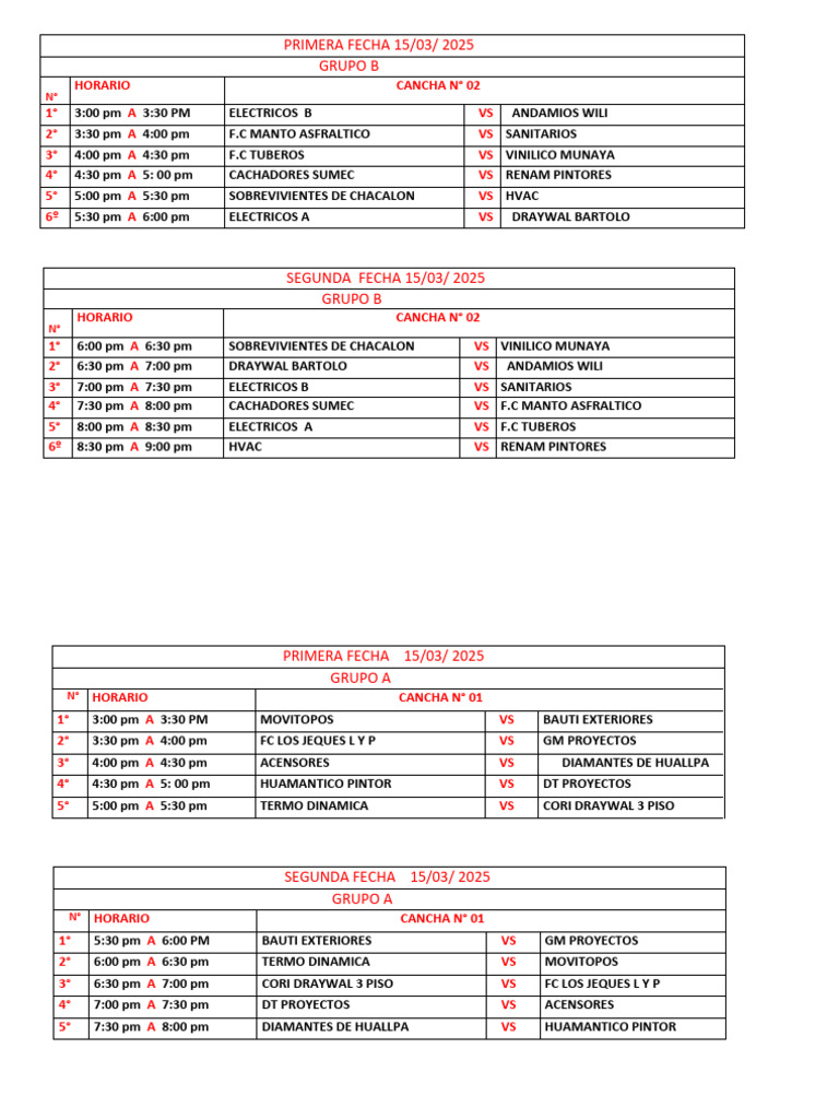 4° 4:30 pm A 5: 00 pm HUAMANTICO PINTOR VS DT PROYECTOS