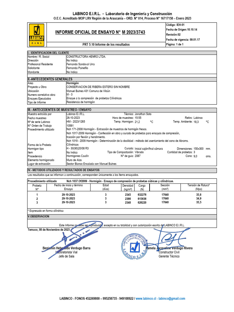 INFORME OFICIAL DE ENSAYO N° M 2023/3743 Revisión:02