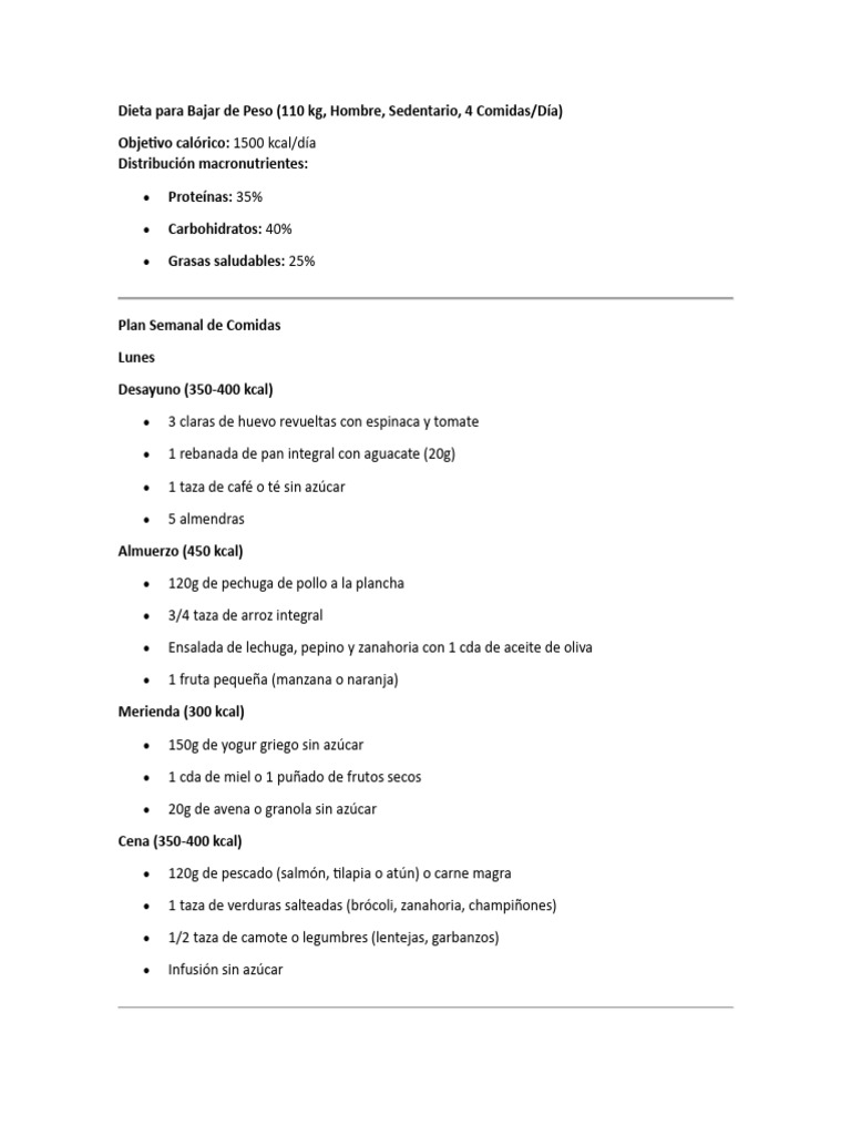 Dieta para Bajar de Peso (110 kg, Hombre, Sedentario, 4 Comidas/Día)
