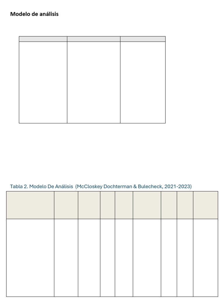 Tabla 2. Modelo De Análisis (McCloskey Dochterman & Bulecheck, 2021-2023)
