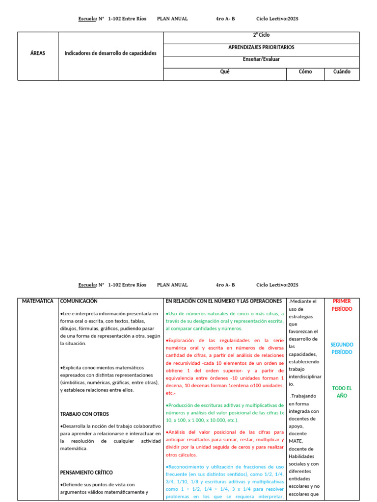 Escuela: N° 1-102 Entre Ríos PLAN ANUAL 4ro A- B Ciclo Lectivo:2025