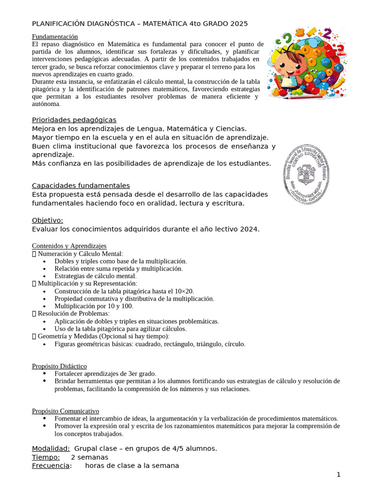 PLANIFICACIÓN DIAGNÓSTICA – MATEMÁTICA 4to GRADO 2025