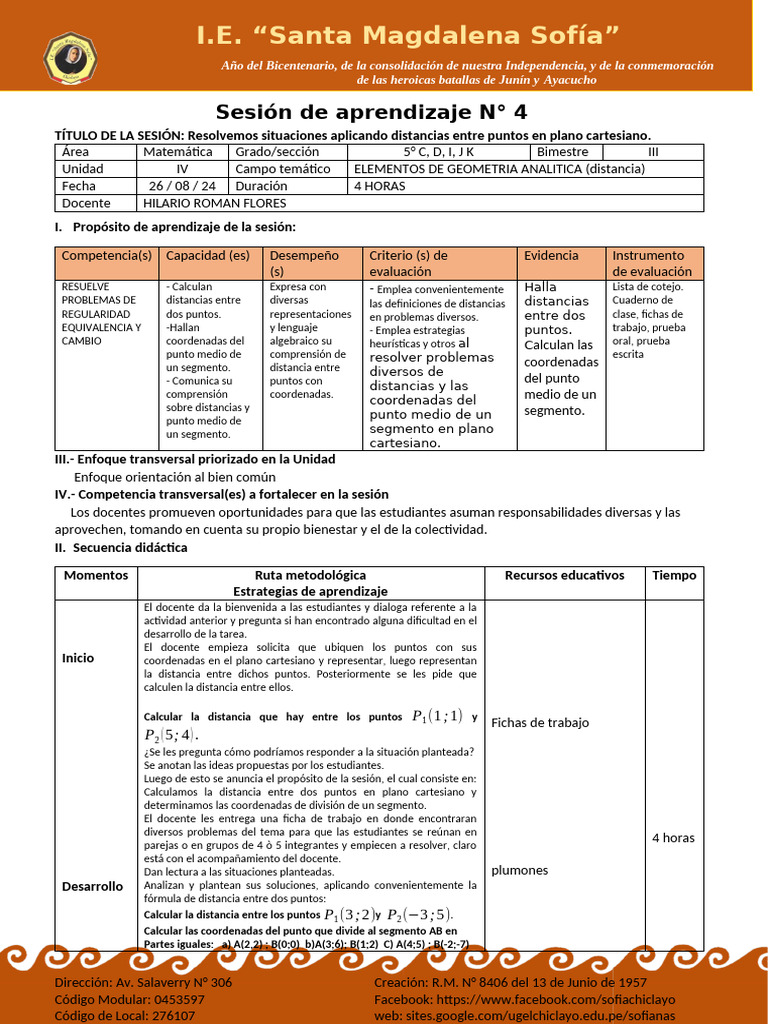 TÍTULO DE LA SESIÓN: Resolvemos situaciones aplicando distancias entre puntos en plano cartesiano.