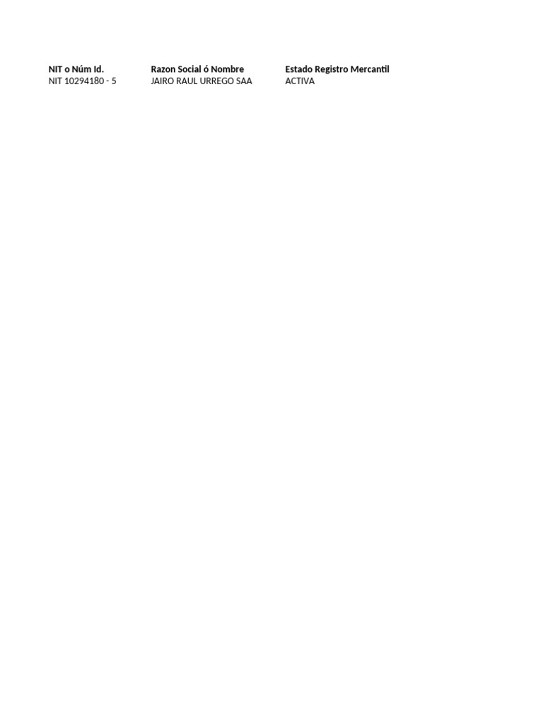 El documento presenta información sobre un registro mercantil. Se menciona el NIT 10294180-5 correspondiente a Jairo Raúl Urrego SAA. El estado del registro es activo.