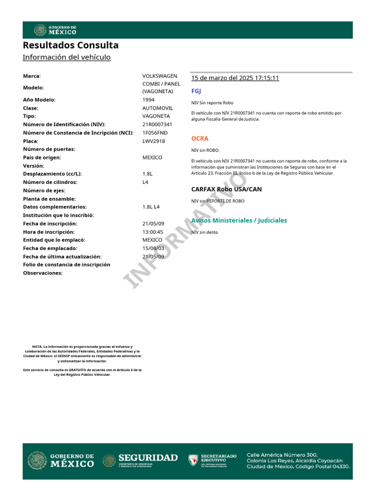 El vehículo con NIV 21R0007341 no cuenta con reporte de robo emitido por