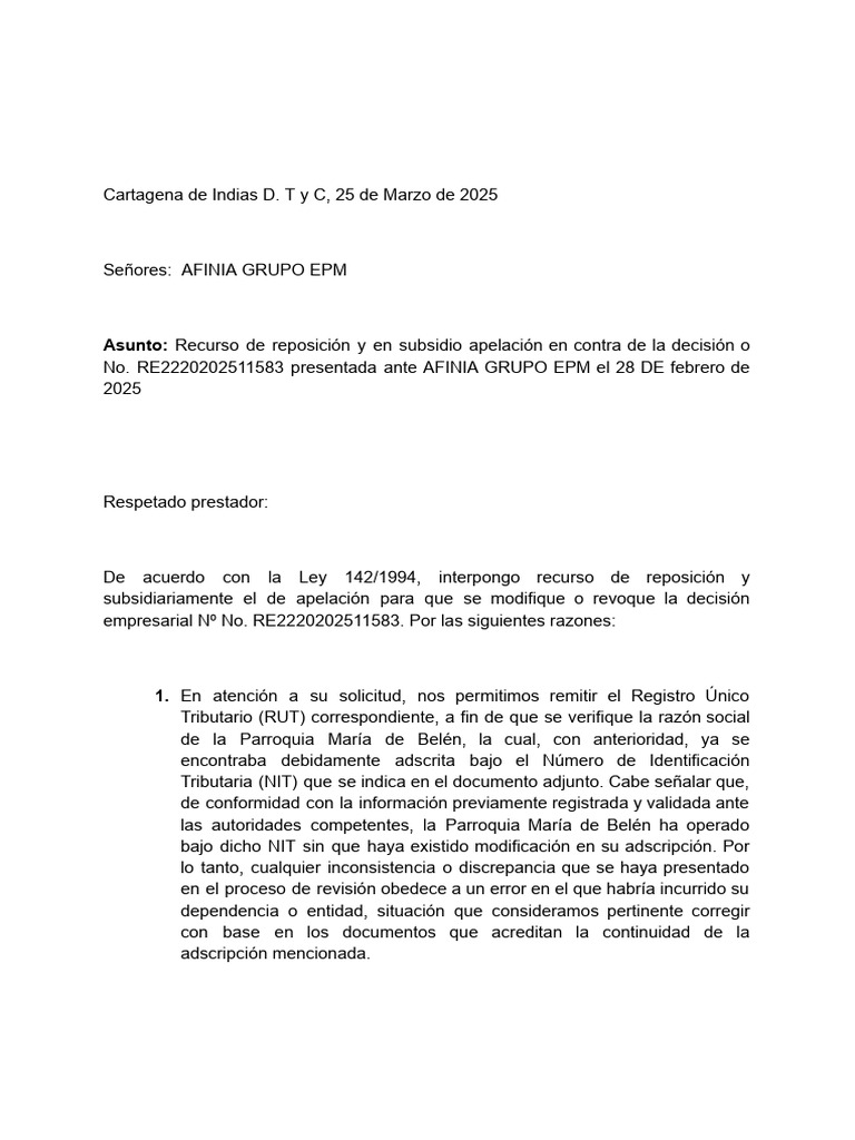 No. RE2220202511583 presentada ante AFINIA GRUPO EPM el 28 DE febrero de