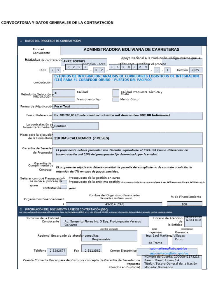 Los interesados podrán recabar el Documento Base de Contratación (DBC) en el sitio Web del SICOES y obtener información de la entidad de acuerdo con los siguientes datos: