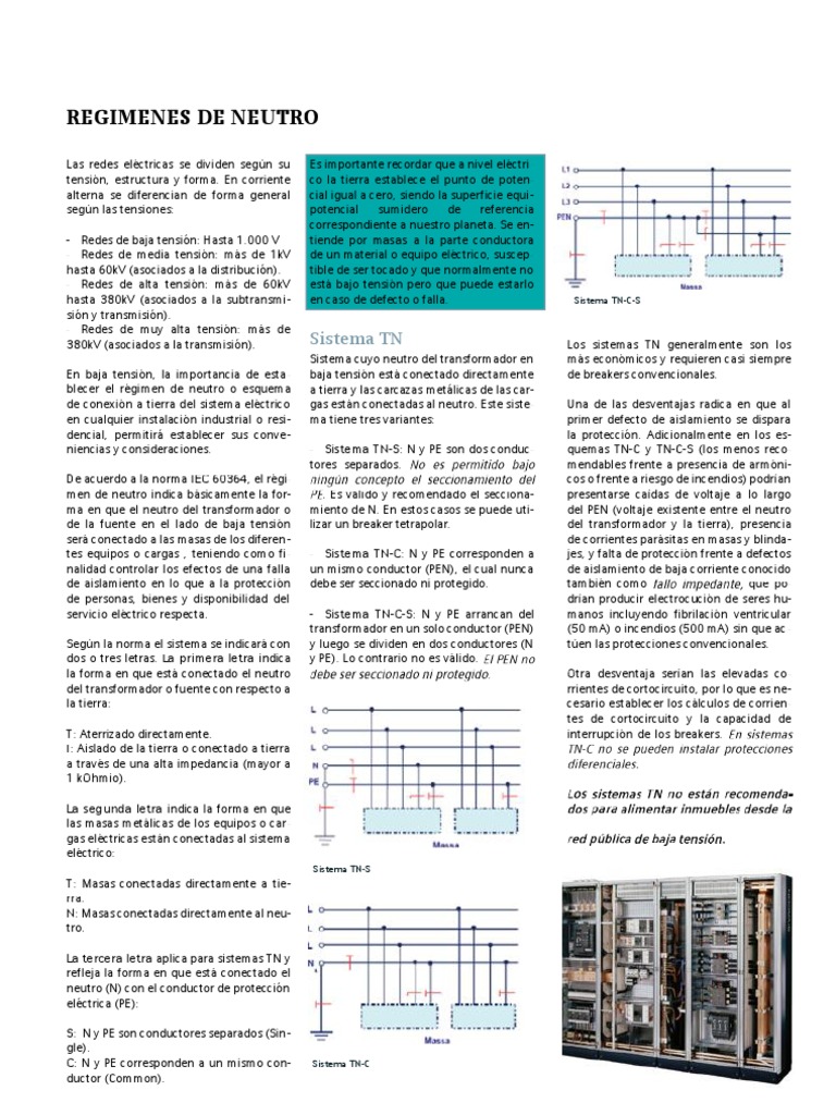 Las redes elctricas se dividen segn su tensin, estructura y forma. En corriente alterna se diferencian de forma general segn las tensiones: - Redes de baja tensin: Hasta 1.000 V - Redes de media tensin: ms de 1kV hasta 60kV (asociados a la distribucin). - Redes de alta tensin: ms de 60kV hasta 380kV (asociados a la subtransmi sin y transmisin). - Redes de muy alta tensin: ms de 380kV (asociados a la transmisin). En baja tensin, la importancia de esta blecer el rgimen de neutro o esquema de conexin a tierra del sistema elctrico en cualquier instalacin industrial o resi dencial, permitir establecer sus conve niencias y consideraciones. De acuerdo a la norma IEC 60364, el rgimen de neutro indica bsicamente la forma en que el neutro del transformador o de la fuente en el lado de baja tensin ser conectado a las masas de los diferen tes equipos o cargas , teniendo como fi nalidad controlar los efectos de una falla de aislamiento en lo que a la proteccin de personas, bienes y disponibilidad del servicio elctrico respecta. Segn la norma el sistema se indicar con dos o tres letras. La primera letra indica la forma en que est conectado el neutro del transformador o fuente con respecto a la tierra: T: Aterrizado directamente. I: Aislado de la tierra o conectado a tierra a travs de una alta impedancia (mayor a 1 kOhmio). La segunda letra indica la forma en que las masas metlicas de los equipos o cargas elctricas estn conectadas al sistema elctrico: