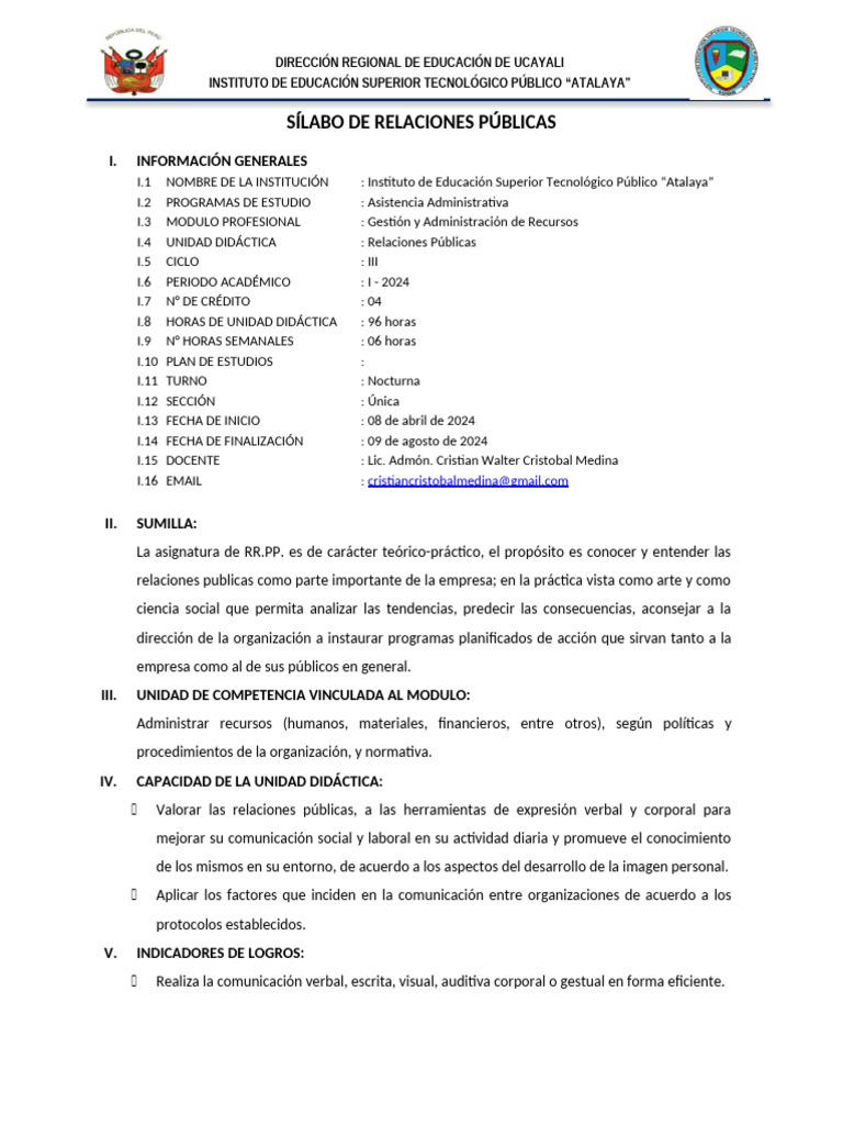 INSTITUTO DE EDUCACIÓN SUPERIOR TECNOLÓGICO PÚBLICO “ATALAYA”