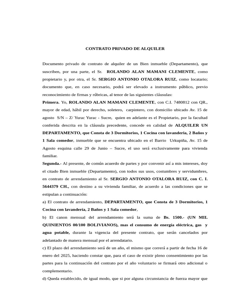 Primera. Yo, ROLANDO ALAN MAMANI CLEMENTE, con C.I. 7480812 con QR.,