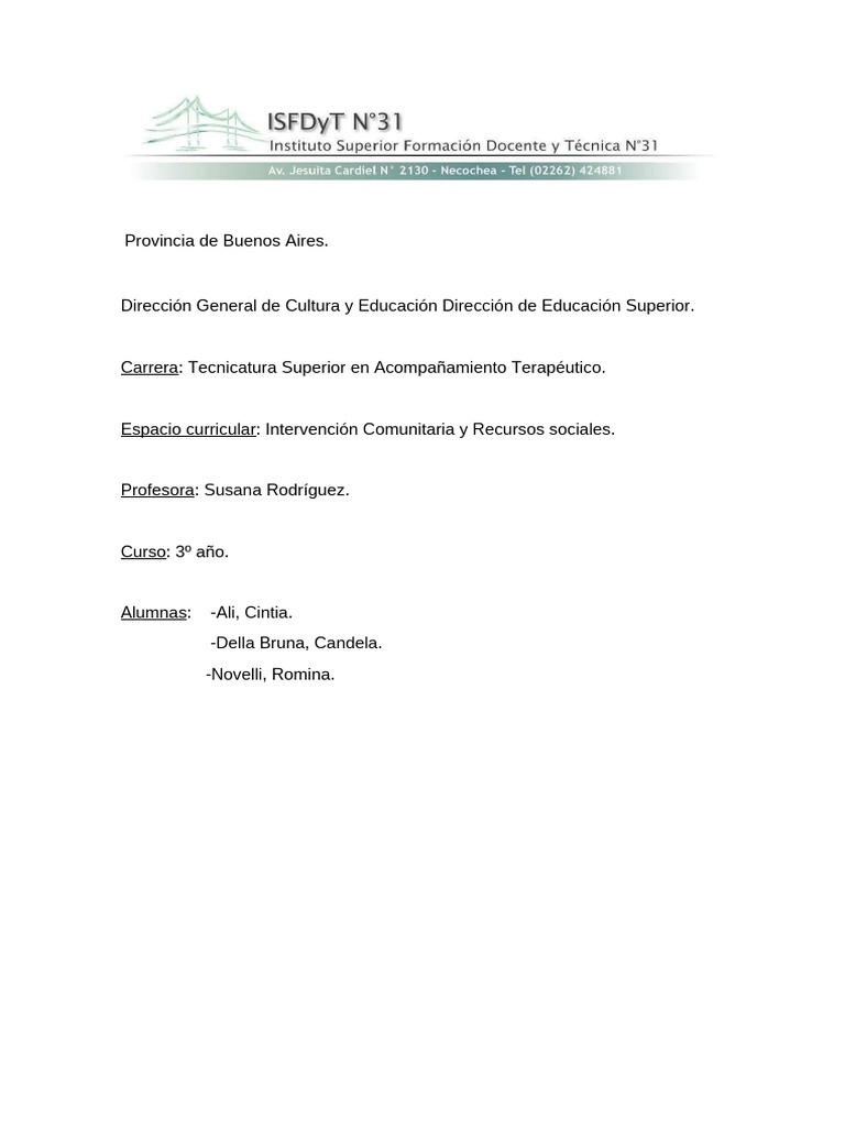 Espacio curricular: Intervención Comunitaria y Recursos sociales.