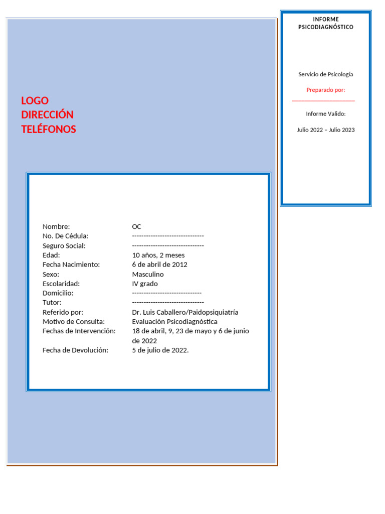 Paciente masculino de 10 años, referido para valoración psicodiagnóstica, presenta un