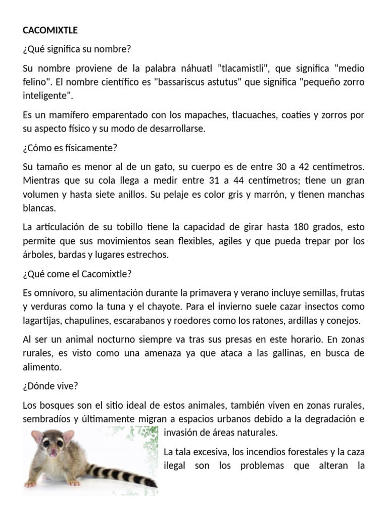 felino". El nombre científico es "bassariscus astutus" que significa "pequeño zorro