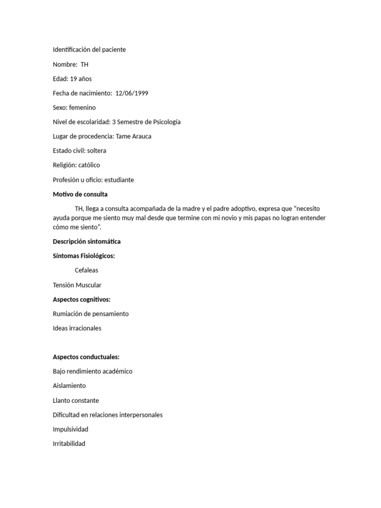 TH, llega a consulta acompañada de la madre y el padre adoptivo, expresa que “necesito