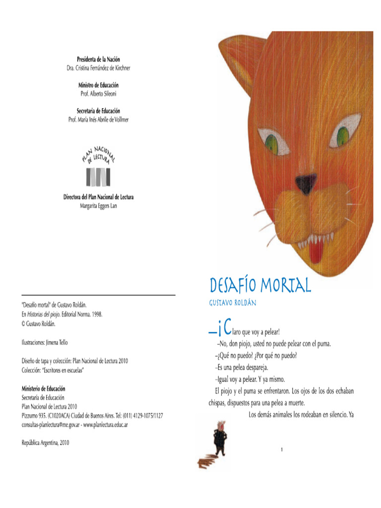 El documento presenta un relato titulado 'Desafío mortal' de Gustavo Roldán, que narra una pelea entre un piojo y un puma, donde el piojo, a pesar de su tamaño, defiende su dignidad ante el puma. A través de la historia, se exploran temas de valentía y la importancia de resistir ante la opresión, incluso cuando las circunstancias parecen desiguales. El texto también incluye información sobre el autor y su trayectoria literaria.