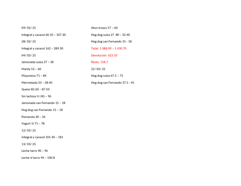 El documento presenta una lista de productos alimenticios con sus precios en diferentes fechas. Incluye artículos como atún, hog dogs, mayonesa, mermelada, queso y leche, con variaciones en los precios. También se menciona una devolución y un total acumulado de precios.