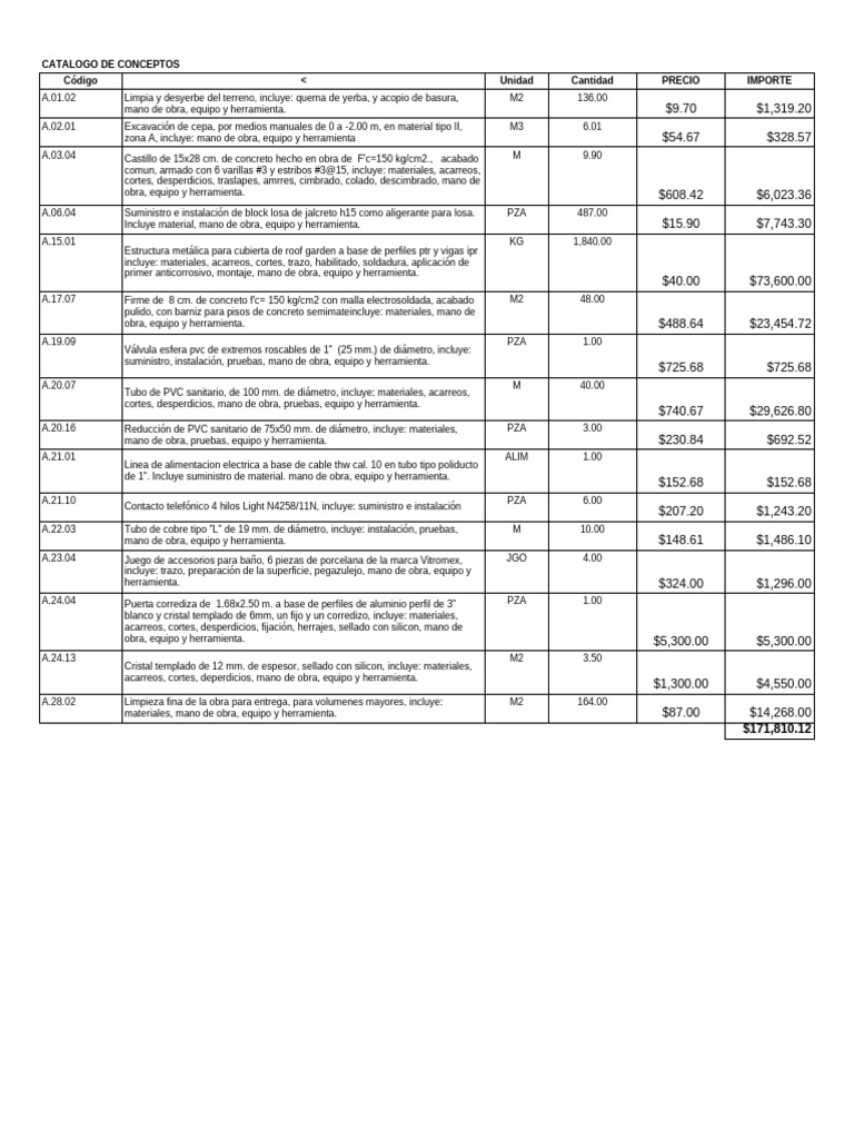 materiales, mano de obra, equipo y herramienta. $87.00 $14,268.00