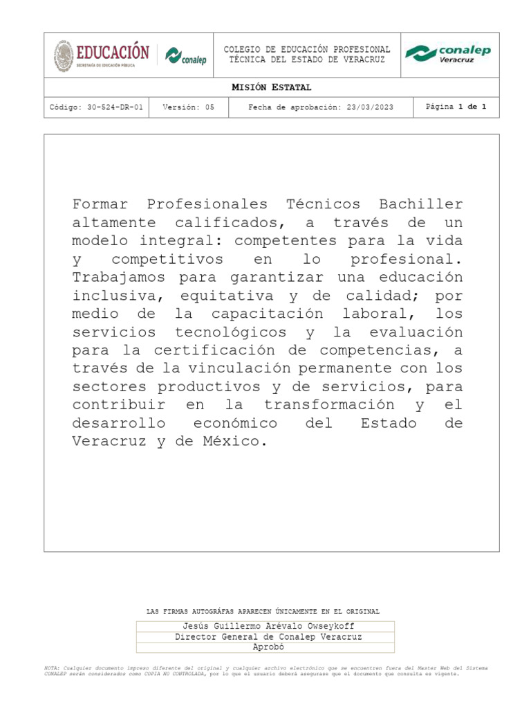 CONALEP serán considerados como COPIA NO CONTROLADA, por lo que el usuario deberá asegurase que el documento que consulta es vigente.