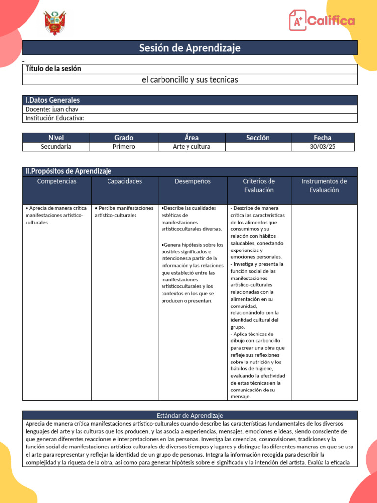 El propósito de la sesión de aprendizaje es que los estudiantes aprecien Los estudiantes crearán un mural colectivo utilizando técnicas de