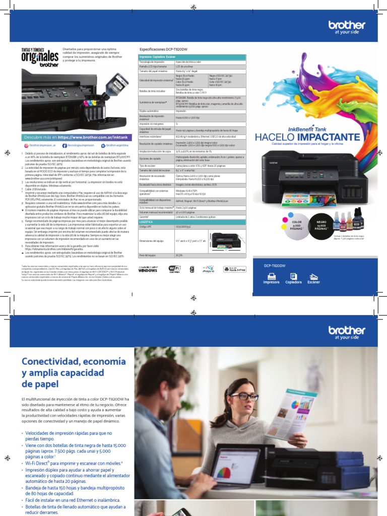 Descubre más en https://www.brother.com.ar/inktank Interfaces estándares† 802.11b/g/n inalámbrica, Ethernet, USB 2.0 de alta velocidad