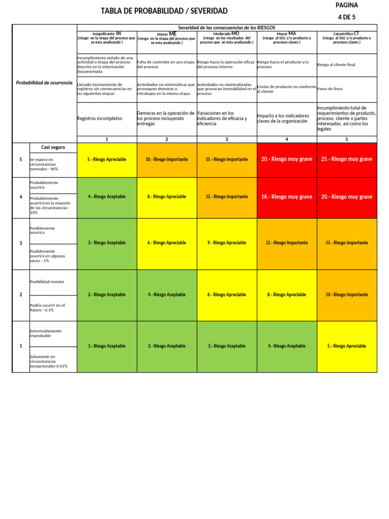 4 Probablemente 4.- Riesgo Aceptable 8.- Riesgo Apreciable 12.- Riesgo Importante 16.- Riesgo muy grave 20.- Riesgo muy grave