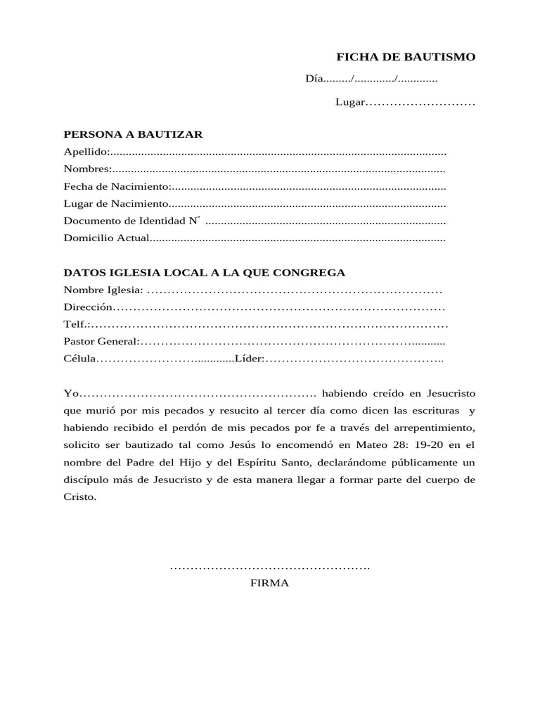 solicito ser bautizado tal como Jesús lo encomendó en Mateo 28: 19-20 en el