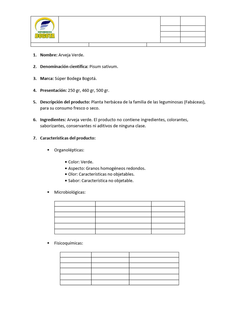 6. Ingredientes: Arveja verde. El producto no contiene ingredientes, colorantes,