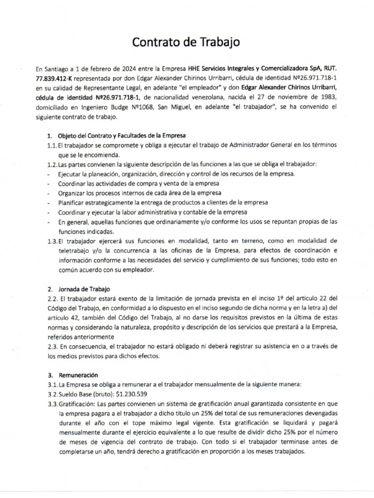 El contrato de trabajo entre HHE Servicios Integrales y Comercializadora SpA y Edgar Alexander Chirinos Urribarri establece que el trabajador se desempeñará como Administrador General con funciones específicas en la empresa. La remuneración mensual será de $1.230.539, con un sistema de gratificación anual del 25% de las remuneraciones devengadas, y el contrato tiene una vigencia indefinida. Ambas partes acuerdan que el trabajador no estará sujeto a la limitación de jornada laboral y que la remuneración se pagará mediante transferencia a su cuenta RUT.