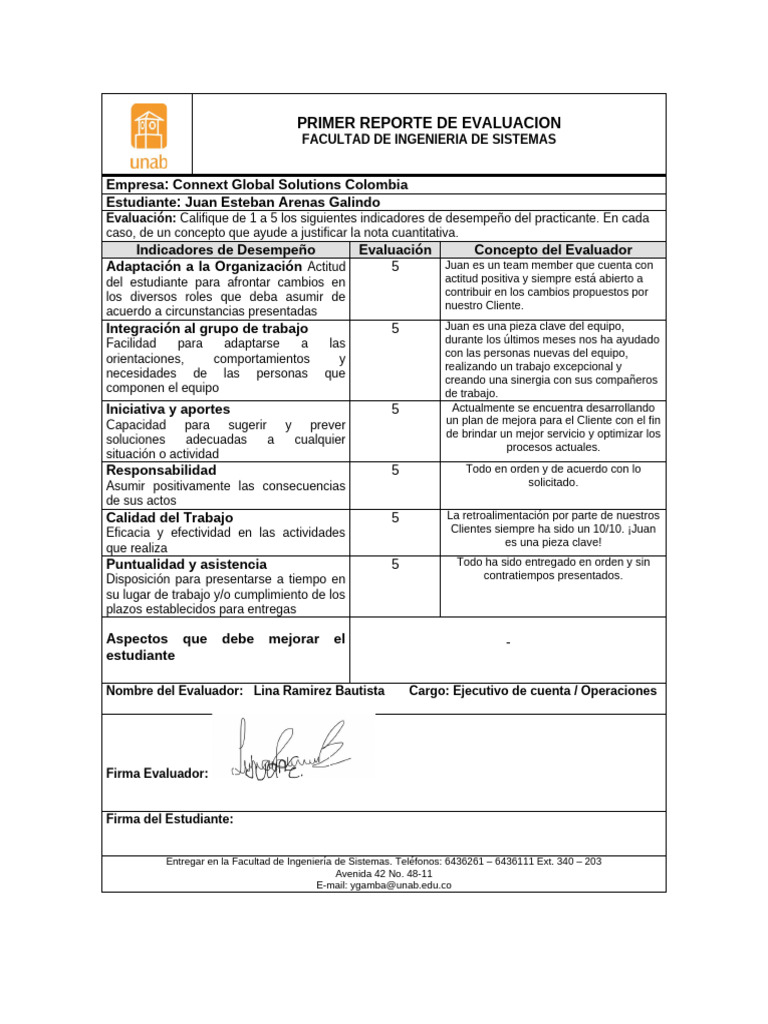 Nombre del Evaluador: Lina Ramirez Bautista Cargo: Ejecutivo de cuenta / Operaciones