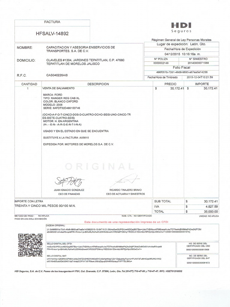 HDI Seguros, S.A. de C, V. Paseo de los Insurgentes 9 1701; Col. Granada; C.P. 37306, León, Gto. Tel (01477) 710-47.00 y 71047-47. RFC: HSE701218532
