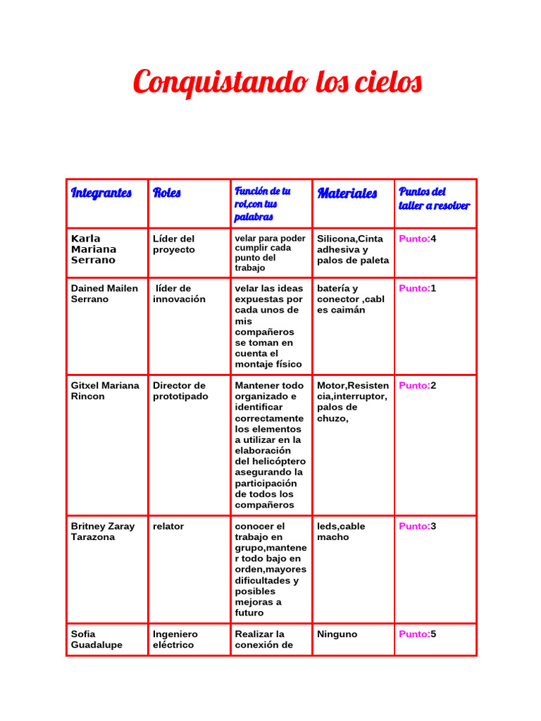 Integrantes Roles Función de tu Materiales Puntos del