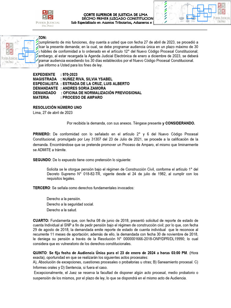 ADMITIR a trámite la demanda de Amparo interpuesta por ANDRES SORIA ZAMORA contra la