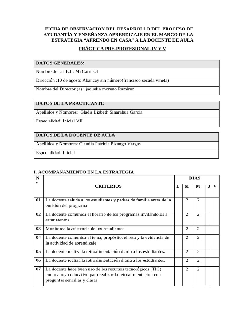 19 Acompaña y evalúa el desempeño de la practicante. 2 2