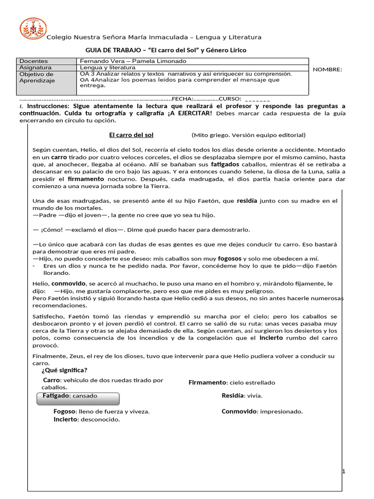 GUIA DE TRABAJO – “El carro del Sol” y Género Lírico