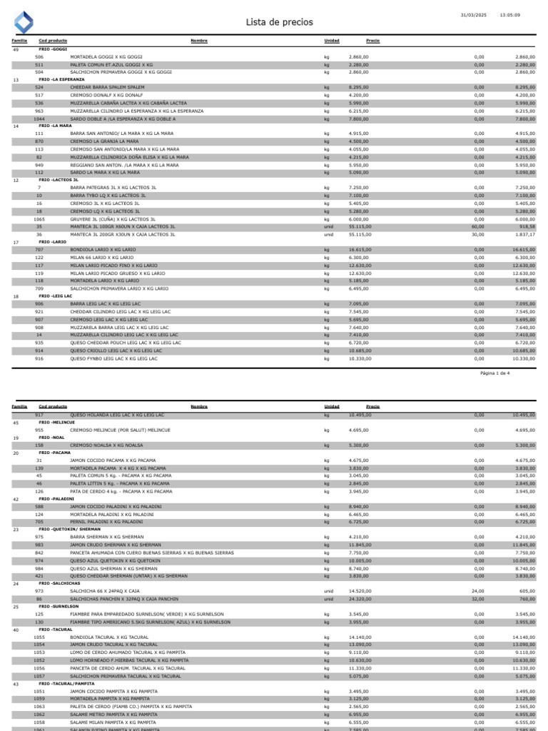 Familia Cod producto Nombre Unidad Precio