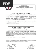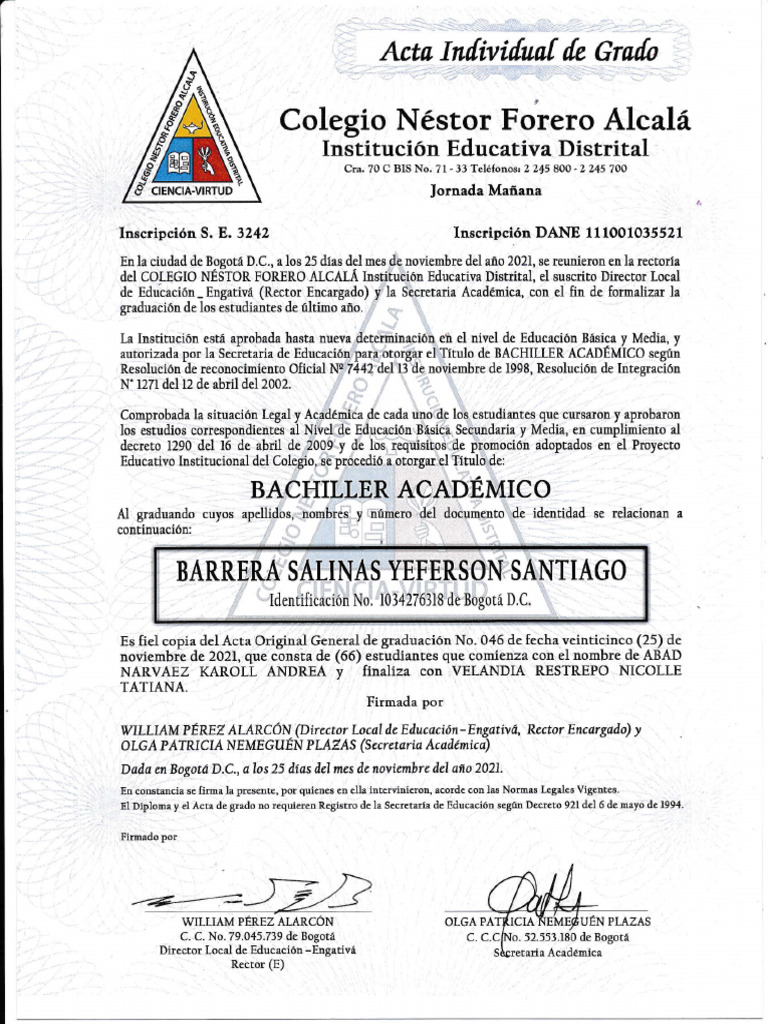 EI Diploma y eI Acra de gtado no requieren Regisrro de la Sec¡etarla dc EducacióD según Decreto 921 del 6 de mayo de 1994.