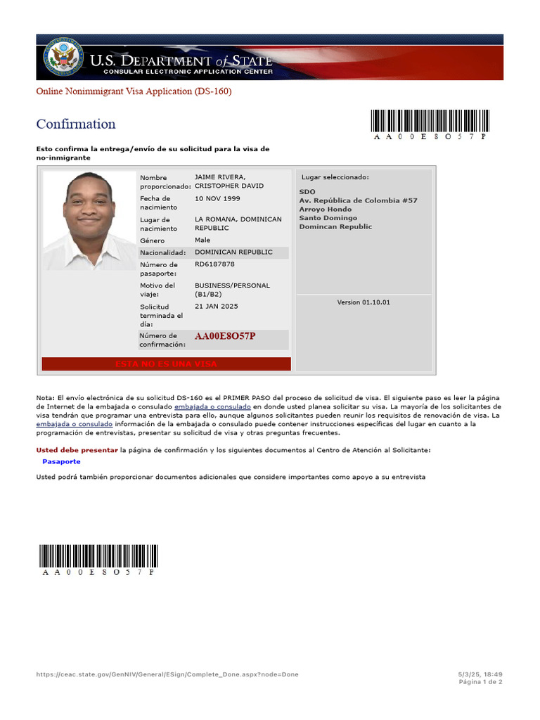 USTED DEBE PRESENTAR la página de confirmación con un código de barras claro y legible en el momento de la entrevista. Si no tiene