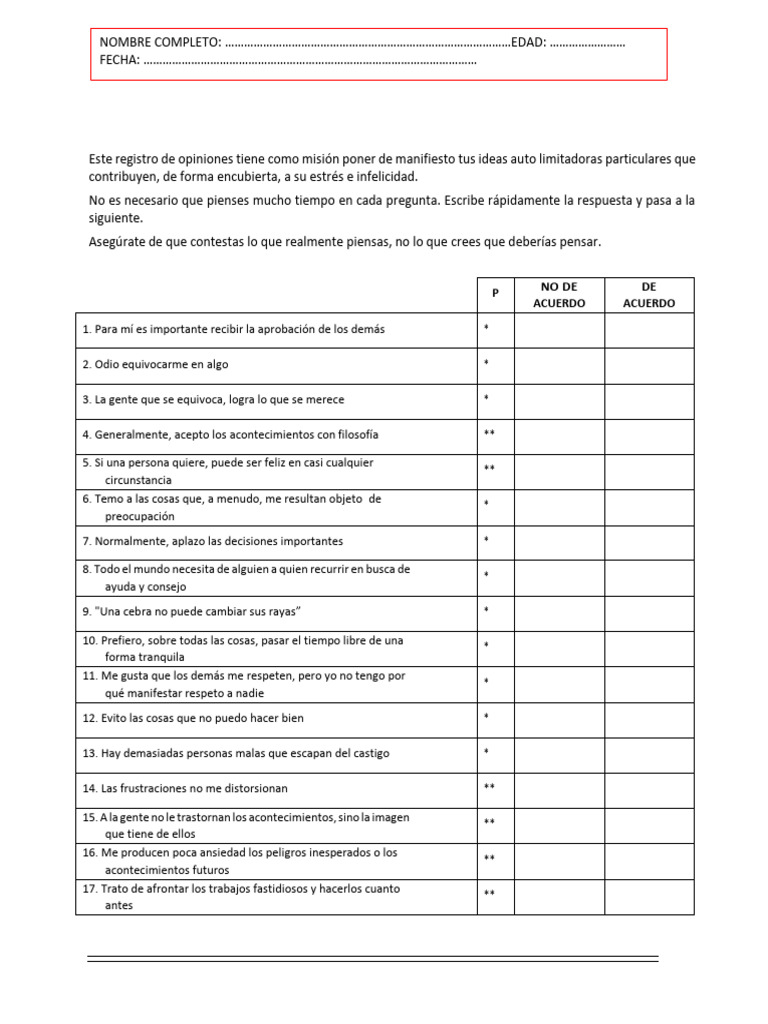 Este registro de opiniones tiene como misión poner de manifiesto tus ideas auto limitadoras particulares que